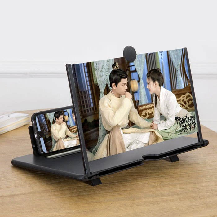 Nyissa ki, emelje fel az összecsukható nagyítóképernyőt az alsó összehajtható rész beállításával, és helyezze a borító rész belső felére a telefont fekvő vagy ááló helyzetben! Amikor megnyit egy fájlt, hogy képeket vagy felvételeket játsszon le a telefonján, egy nagyított képet fog látni, amelyet azonnal meg fog látni a nagyító részen.