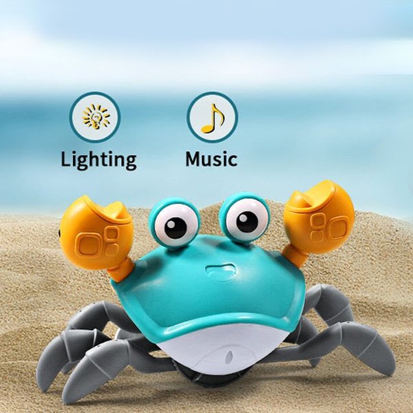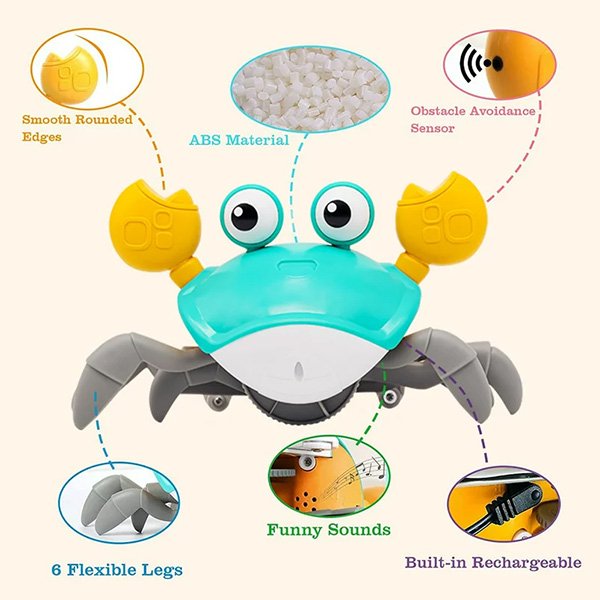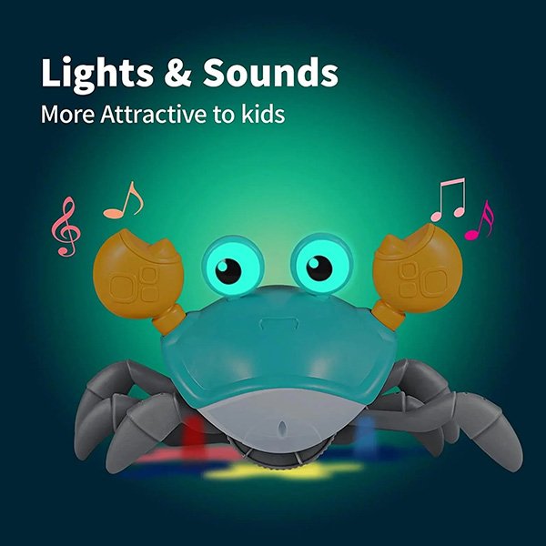 Figyelje, ahogy a kicsik elképedve nevetnek, amint kölcsönhatásba lépnek ezzel a aranyos Crabyval, amint körbe mászik a zenével és fényekkel.