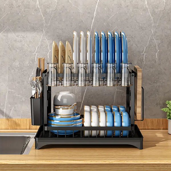 A Drainy edénytartó zseniálisan tervezett, hogy maximalizálja a konyhai pultteret. Többszintes szerkezete könnyedén tartja a tányérokat, tálakat és evőeszközöket, lehetővé téve több elem szárítását egyszerre, időt és energiát spórolva a forgalmas konyhai rutinban.