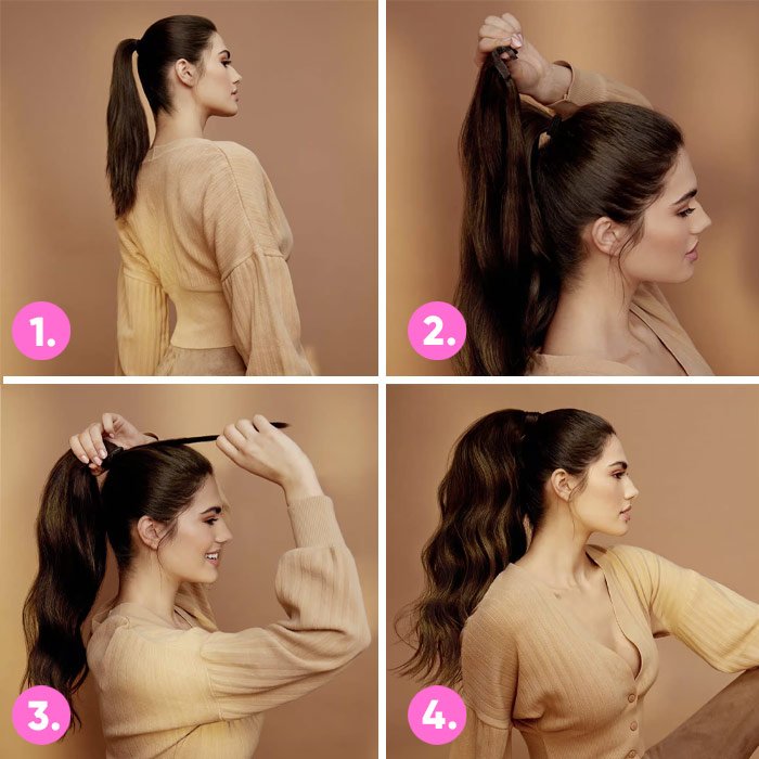 Fésülje ki a természetes haját és készítsen lófarkat egy szalaggal. Majd, használjon egy pántot a gumis szalag körül és fogja össze a mesterséges hajat, ami hozzátapad a szalaghoz. Nagyobb stabilitáshoz használjon hajcsatot, amivel megerősíti a lófarkat.