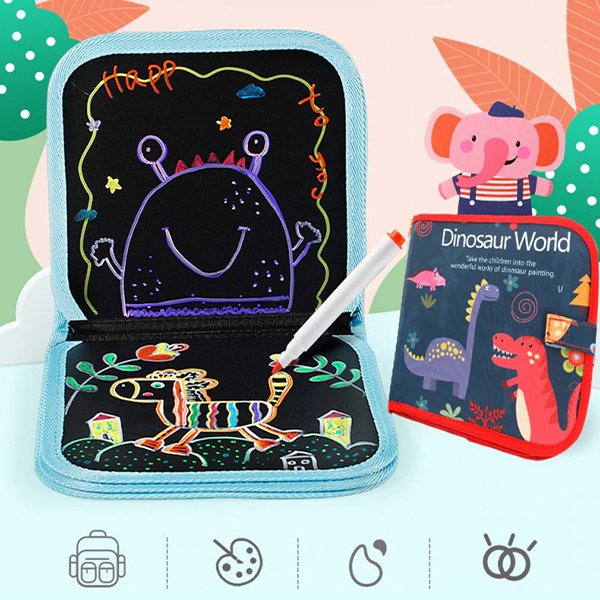 A játék nagyon praktikus, puha és összecsukható, a gyermek mindig magával viheti. A készletet úgy tervezték, hogy nagyon kényelmes legyen, egy tasakkal és egy zsebbel a filctollak számára.