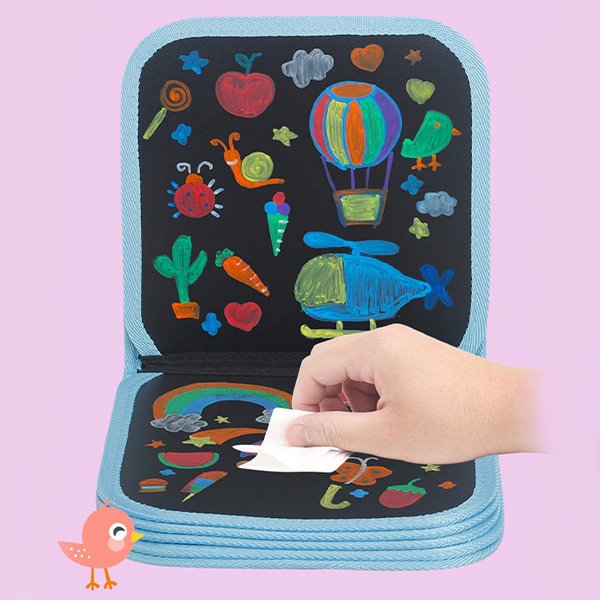 A füzetben található alkotások könnyen letörölhetők, így soha nem fogy el a helyük, hogy a gyerekek kreativitása kibontakozhasson.