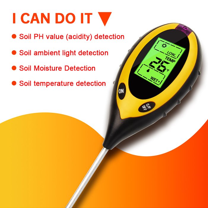 Bemutatjuk a 4 az 1-ben talajmérőnket. Funkciói nagyon sokrétűek, talajnedvesség, hőmérséklet, talaj pH és napfény intenzitás mérésére alkalmas. Ez a legjobb eszköz a növények egészségének és növekedésének nyomon követésére.