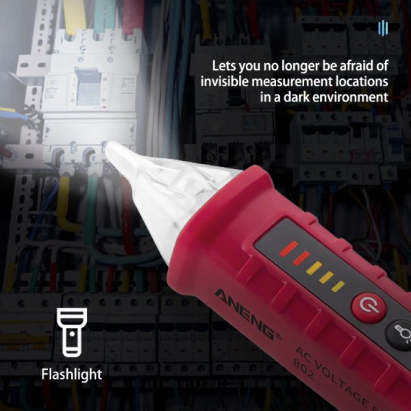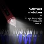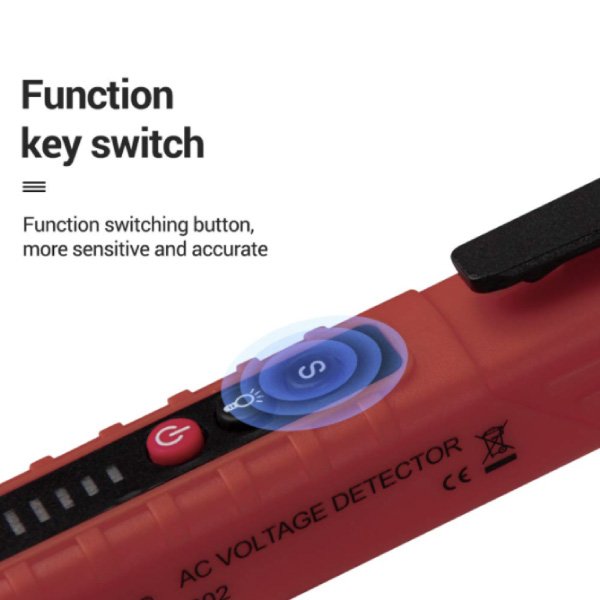 Az AC érzékelő végén egy beépített fehér LED fény található, amely megvilágítja az eszközöket, így könnyebben dolgozhat sötétben. Az érintés nélküli fázisceruza 5 perc inaktivitás után automatikusan kikapcsol.