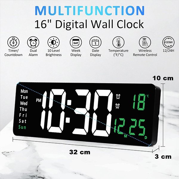 Digitális fali óránk nem csak az időt mutatja, hanem tartalmaz további funkciókat, mint például a dátumot, hőmérsékletet és ébresztő beállítási lehetőségeket, ezáltal sokoldalú és praktikus darabbá téve bármely háztartásban.