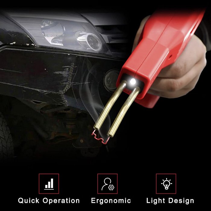 Válassza ki a megfelelő hegesztőbilincseket a műanyag repedéseinek megfelelően, helyezze be a sárgaréz tartót és nyomja meg a bekapcsoló gombot. A hegesztő két másodperc alatt felmelegszik. Helyezze a kapcsot a kívánt helyre és várja meg, amíg a műanyag lassan megolvad. Ügyeljen arra, hogy ne szúrja ki a tárgyat.